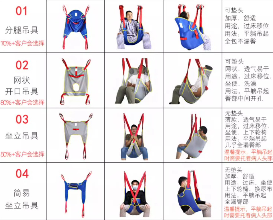 吊具不包臀部,针对上下轮椅更轻松,可上厕所;可以靠头更舒适